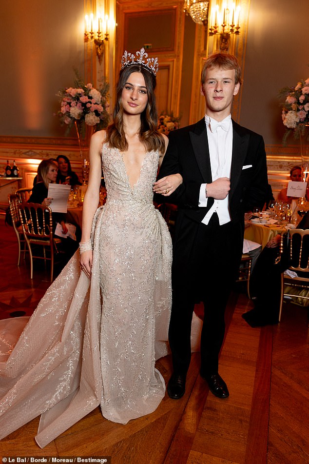 Gabrielle Janssens de Balkany, 21, turned heads in a gown by Italian designer Luisa Beccaria, as she was accompanied by her brother, Tomasso.
