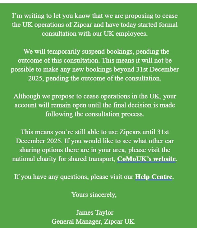 Closing: In an email to customers, Zipcar plans to cease its operations in London