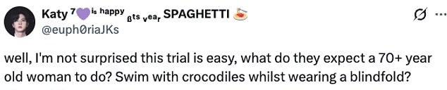 Taking to X they fumed: ‘Easiest trial ever, clearly fixed for her’: ‘I mean ofc they’re gonna simply a trial for Ruby she’s 70 you freaks lol!’: ‘I’ve got to be honest this trial was too easy’: ‘This trail is too easy for Ruby, so rigged’.
