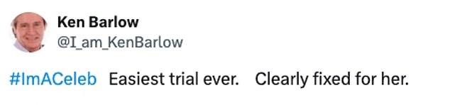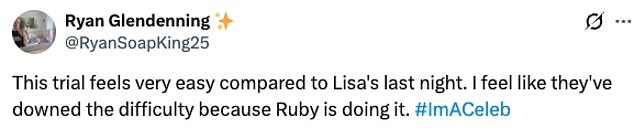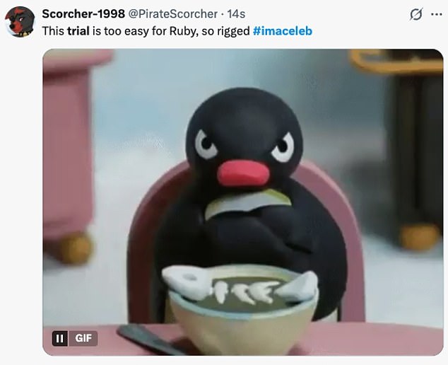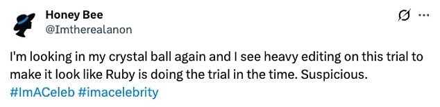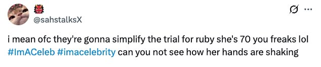 ‘Well, I’m not surprised this trail is easy, what do they expect a 70+ year old woman to do? Swim with crocodiles whilst wearing a blindfold?’: ‘I’m looking in my crystal ball again I see heavy editing on this trial to make it look like Ruby is doing the trail in time. Suspicious’.