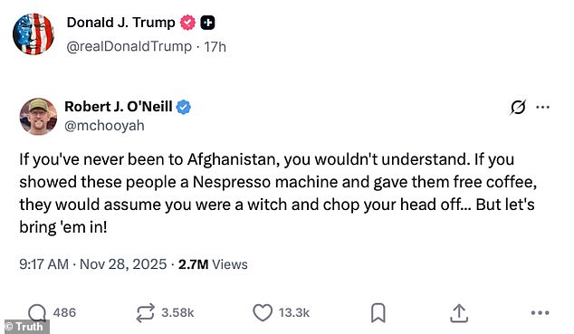 President Donald Trump shared a social media post claiming Afghans would ‘chop off your head’ and ‘assume you were a witch’ if you showed them a Nespresso machine.